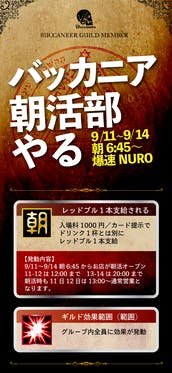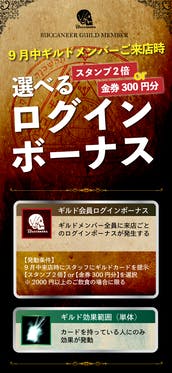 9月からギルドメンバーログインボーナス始まります。ギルドメンバーの皆様、いつもありがとうございます。次回からお店にご来店いただく際には”ギルドメンバーカード”をお忘れなくご提示ください。ログインボーナスとして選べる特典をご用意いたしました。①スタンプ2倍②バッカニア紙幣300円分※2000円以...