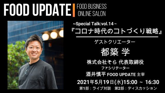 #30【スペシャルトーク Vol.14】テーマ『コロナ時代のコトづくり戦略』■ゲストクリエーター株式会社そら都築学氏代表取締役■ファシリテーターFOOD UPDATE酒井慎平 運営責任者■内容第1部:セミナー(無料公開)30分第2部:ディスカッション(サロンメンバーのみ)60分■会場(予定)~...