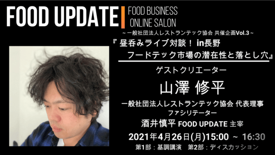 #27【一般社団法人レストランテック協会 共催企画Vol.3】『昼呑みライブ対談!in長野 フードテック市場の潜在性と落とし穴』■ゲストクリエーター一般社団法人レストランテック協会山澤 修平 代表理事■ファシリテーターFOOD UPDATE酒井慎平 主宰■内容【無料公開】第1部:ライブ対談(約...
