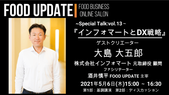 #28【スペシャルトークVol.13】テーマ『インフォマートとDX戦略』■ゲストクリエーター株式会社インフォマート大島大五郎 元取締役 顧問■ファシリテーターFOOD UPDATE酒井慎平 主宰■内容第1部:セミナー(無料公開)60分第2部:ディスカッション(サロンメンバーのみ)30分■会場~...