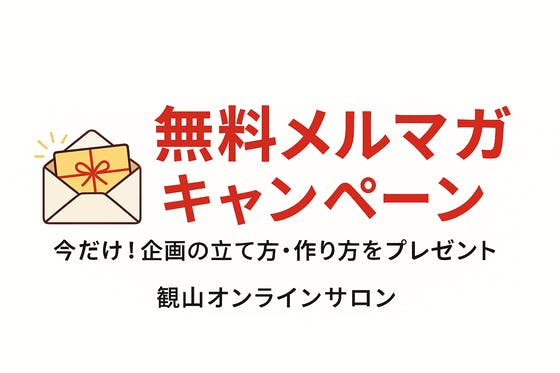「あなたのアイデアが形になる!今だけ無料メルマガキャンペーン」登録すると、すぐに【企画の立て方・作り方】をお届け。観山オンラインサロンの世界を、まずは無料で体験してください。