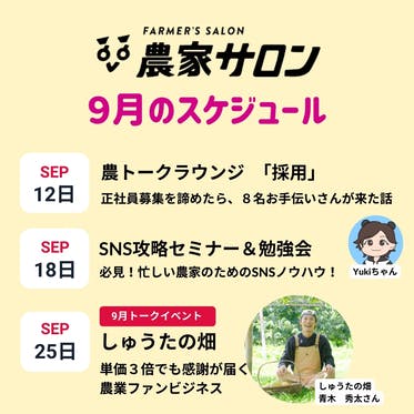 9月の農家サロンで開催するトークイベント、勉強会です!農業の皆んなで語り合う会、SNSで目的を達成する勉強会、実績を持った農家さんのトークセッションなどなど、盛りだくさん!是非ご参加お待ちしています^ ^