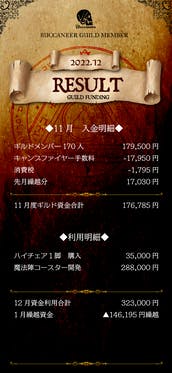 12月のギルド資金報告です今回のギルド資金はお店の設備投資に使わせていただきました。新・魔法陣コースターが結構お高くついてしまいましたが、長く使えるバッカニアの完全オリジナルの製品を企画開発しました!そしてカウンター席に急にひとつだけ配置されたハイチェアですが、座ってくださった皆様におおむねご...