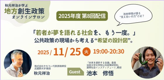 【活動報告】11/25 ゲスト:池本周五さん「社会を変えるのは、制度よりも『おせっかい』!?」こんにちは、秋元サロン事務局です。先日の対談、ご覧になりましたでしょうか?ゲストは法政大学教授の池本周五さん。秋元さんとは大学時代からの25年来の親友ということで、冒頭からリラックスした雰囲気……と思...