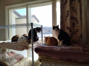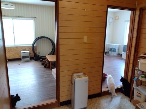 冬季閉鎖中だった8畳の部屋を開放しました。8畳8畳6畳4畳半と階段の踊り場スペース2畳くらいを必要に応じて開放して大部屋にしてます。現在は6畳を一時預かりの子達7匹に使用。3部屋をフリースペース。必要に応じてドアを閉めて卒業生のお泊りや一時預かり、TNRの子達の一時保護スペースになります。