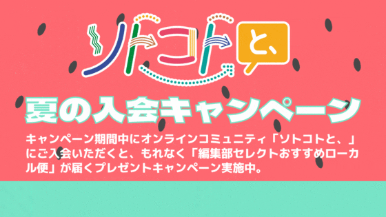 暑い日が続きますね。オンラインコミュニティ「ソトコトと、」では夏の入会キャンペーンを実施中です。期間中にご入会いただくと下記の通常リターンにくわえて、もれなく「編集部セレクトおすすめローカル便(500円相当)」をお届けします。2021年8月31日(火)24:00まで。期間中に入会登録いただくだ...