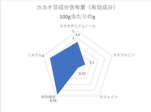 こんにちは。カカオの成分をわかりやすくするために健康に有効だと言われる成分だけでグラフに表示してみました。カカオポリフェノール、食物繊維、ミネラルが豊富に含まれていることがわかります。カカオポリフェノールには、主に抗酸化作用があります。抗酸化作用によって、心臓病や発癌リスク低減、動脈硬化の抑制...