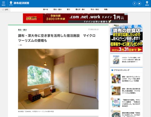 深大寺COMORIの記事を調布経済新聞に掲載いただきました。星野リゾートの星野さんが提唱した「マイクロツーリズム」も意識して企画を組み立てさせていただいています。これからPRにも力を入れていきたいと思います。取材をいただけるメディアの方などいらっしゃいましたら、ぜひお声がけいただけますと幸いです!