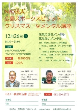 「広島スポーツスピリット クリスマス Wメンタル講座」 12月26日(木)18時30分~ まちづくり交流プラザマルチメディア室