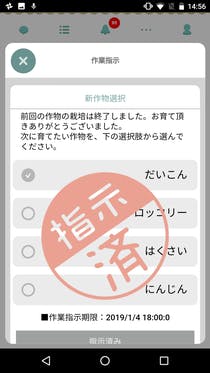 【作業指示】あしがら会員は、ご自身のマイブロックに対して「作業指示」を行うことができるようになりました。まずは順次皆様にテストとして、栽培する「作物選択」を伺う配信を行っています。