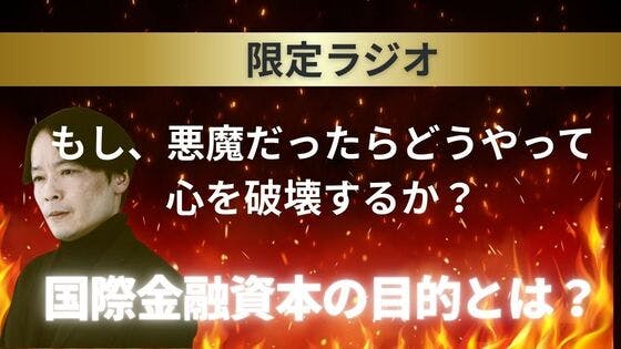 講演会や動画では話せないこと…を、【白鳥哲の<活動応援基金>】への参加者限定ラジオでお伝えしています!1/22に【メンバーの方に配信されたラジオ】は、【もし、悪魔だったらどうやって心を破壊するか?〜国際金融資本の目的とは?〜】メンバーになると過去の【限定ラジオ】配信もお聞きいただけますので是非...