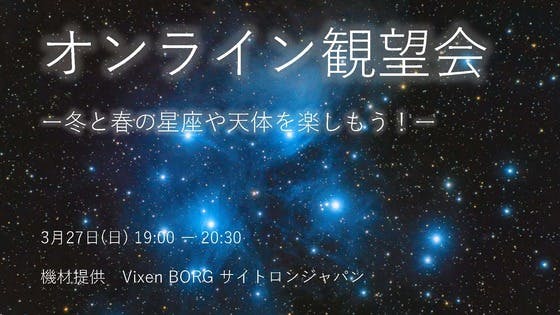 名取天文台のはたけです。3月27日19時より、3月のオンライン観望会を配信いたします!冬から春にかけて観察できる星座や天体をたくさん観察します。参加無料でどなたでも気軽にご参加いただけます。【日時】3月27日(日)19時~20時30分【配信先】配信では、天体望遠鏡と自動導入赤道儀、天体観察用カ...