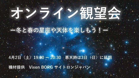 名取天文台のはたけです。4月2日(土)19時より、4月のオンライン観望会を配信いたします![冬から春にかけて観察できる星座や天体をたくさん観察します。参加無料でどなたでも気軽にご参加いただけます。【日時】4月2日(日)19時~20時30分 悪天時は4月3日(日)に延期【配信先】配信では、天体望...