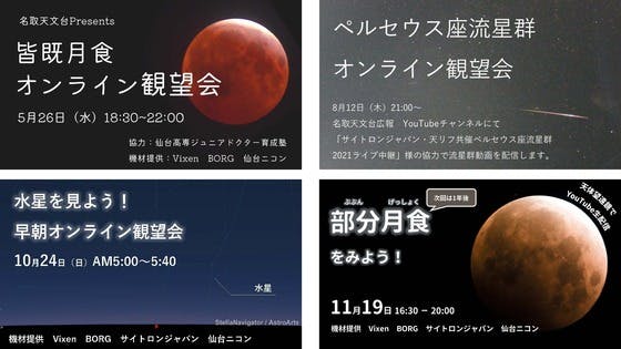 みなさんこんにちは。名取天文台のはたけです。今回は、オンライン観望会の2021年の活動報告をさせていただきます!2021年は合計で14回ものオンライン観望会を開催しました。そのうちいくつかを抜粋してご紹介させていただきます。天文現象2回の月食やペルセウス座流星群、水星が西方最大離角(観察しやす...