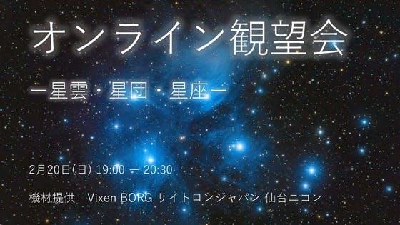 名取天文台のはたけです。2月20日(日)19時より、オンライン観望会を開催します!参加無料でどなたでもご参加いただけます。冬に見える星雲や星団を中心に天体観察をしていきます。冬は大型で見ごたえのある天体がたくさんある季節です!名取天文台のオンライン観望会で冬の美しい天体を存分に楽しみましょう!...