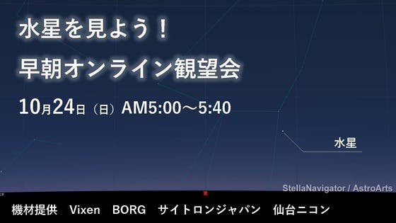 10月24日(日)午前5時より水星を観察するオンライン観望会を開催します!【水星を見よう!早朝オンライン観望会】日時:10月24日(日)午前5:00~午前5:40内容:夜明け前の東の空に見える水星を天体望遠鏡を使って観察します。配信先はこちらなかなか見ることのできない水星を名取天文台の配信で楽...