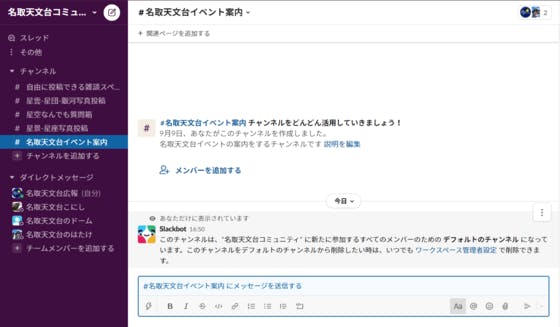こんにちは名取天文台のはたけです。この度、名取天文台コミュニティのメンバー限定が参加できるSlackを開設します!Slackとは参加するとだれでもチャットで投稿ができ、グループのメンバー間でやりとりすることも可能なチャットツールです。他のSNSツールとは違い、話題ごとにチャンネルを作ることがで...