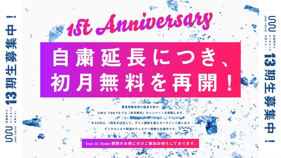 緊急事態宣言の延長を受け、UMU TOKYO では 2020年5月1日より「初月無料」キャンペーンを再開いたします。 また5月は、創立1周年を記念して、ゲスト講師を迎えオンラインで楽しめるデジタルシネマ関連のウェビナー開催も企画中です。#StayHome 期間のおともに、是非みなさまのご参加を...