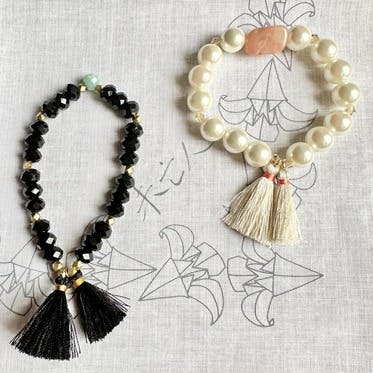 映画「未亡人」オリジナルグッズ第2弾!未亡人の数珠ブレスレット白黒セットです☆彡劇中で未亡人が握りしめている数珠をイメージ。数珠ブレスレット白はアイボリーの樹脂パールにシャンパン色のガラスビーズと、可愛いタッセルをあしらいました。ピンクの天然石パワーストーン・アベンチュリンがポイントです。ピン...