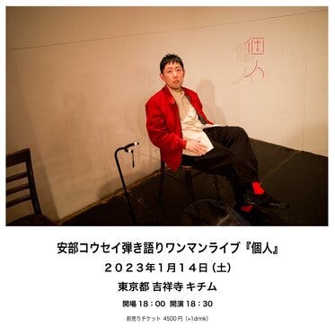 安部コウセイ弾き語りワンマンライブの開催が決定しました!チケット受付開始しております。===========================【公演詳細】安部コウセイ弾き語りワンマンライブ『個人』2023年1月14日(土)会場:吉祥寺キチム開場18:00 / 開演18:30チケット:全自由4,5...