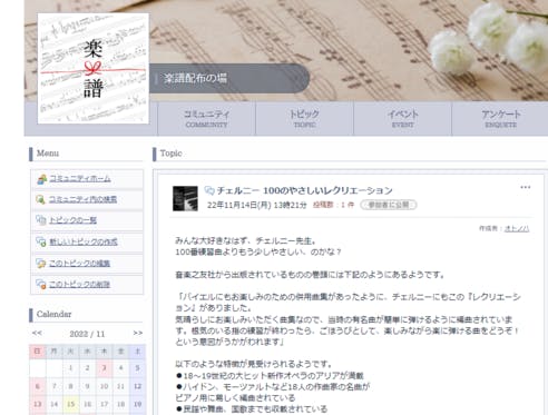 ようやく動き始めることができ、少しずつ会員専用のSNSも充実してまいりました。このように、週に1~3曲の楽譜の配布をいたします。現在はまだピアノさんしかいないのでピアノ曲が中心ですが、今後会員様が使用する楽器の割合に応じていろいろな楽譜を配布する予定です。ピアノ伴奏でフルートやチェロ、バイオリ...