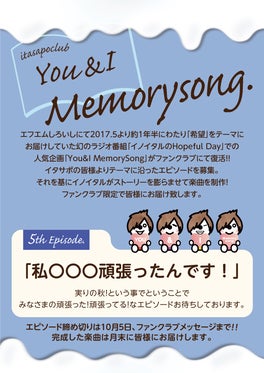 2月から始まった「You&I MemorySong 」第5回目のエピソードは「私〇〇〇頑張ったんです!!」エピソードを大募集(*'ω'*)頑張った!頑張ってる!エピソードたくさんお待ちしています★お送りいただいたエピソードは、一部イタ飲みでご紹介予定です(^^)/エピソードの受付は「ファンクラ...