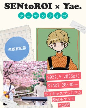 この度、5月にシンガーのYae.さんとツーマンライブを開催することが決まりました!なお、今回は無観客配信ライブにてお届けさせていただきます!リアルタイムでご覧になれない方もアーカイブは2週間残りますのでチケットご購入して頂けますので是非ご覧ください!【詳細】5月28日(土)ツイキャスプレミアム...