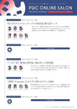 日頃よりPWC オンラインサロンをご愛顧いただき誠にありがとうございます。先日、配信を延期いたしました「白キャンとファンミ! 第16回『真っ白なキャンバス フリーライブ2022夏』振り返りトーク」につきまして、振替日が【8月17日(水)21:00 〜】に決定いたしましたのでご案内申し上げます。...