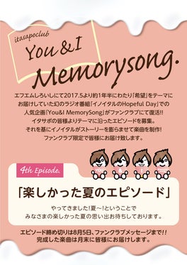 2月から始まった「You&I MemorySong 」第4回目のエピソードは「楽しかった夏のエピソード」を大募集(*'ω'*)みなさまの夏の思い出、たくさん送ってくださいね!エピソードの受付は「ファンクラブメッセージ」・締め切りは8月5日(金)までとなっております!ぜひぜひ皆様のご参加お待ちし...