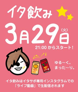 ★イタサポ特典の「イタ飲み」★非公開のインスタグラムアカウントにて、イタルがお酒を呑みながら好きなモノをひたすら語る「イタ飲み」【3月29日(火)21時】 からです!ライブ配信中にメッセージを送って、イノイタルと楽しい時間を過ごしましょう♪皆様のご参加、お待ちしております(^^)/------...