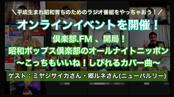 こんにちは、昭和ポップス倶楽部代表のかなえ氏です!3月18日(金)、オンラインにて3月度イベントを開催しました!今回はコミュニティとして初の試み「ラジオ番組」を完全再現。私(かなえ氏)がパーソナリティとなり、今回のテーマである「こっちもいいね!しびれるカバー曲」を紹介していきつつ、平成生まれの...