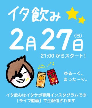 ★イタサポ特典の「イタ飲み」★非公開のインスタグラムアカウントにて、イタルがお酒を呑みながら好きなモノをひたすら語る「イタ飲み」【2月27日(日)21時】 からです!ライブ配信中にメッセージを送って、イノイタルと楽しい時間を過ごしましょう♪皆様のご参加、お待ちしております(^^)/------...