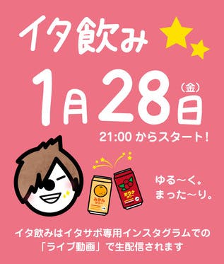 ★イタサポ特典の「イタ飲み」★非公開のインスタグラムアカウントにて、イタルがお酒を呑みながら好きなモノをひたすら語る「イタ飲み」【1月28日(金)21時】 からです!ライブ配信中にメッセージを送って、イノイタルと楽しい時間を過ごしましょう♪皆様のご参加、お待ちしております(^^)/------...