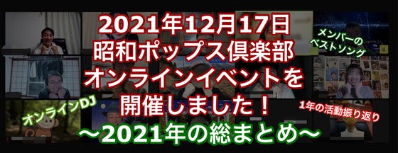 こんにちは、昭和ポップス倶楽部代表のかなえ氏です。2021年も間も無く終了、本当にあっという間の1年間でしたね〜。昭和ポップス倶楽部では、12月17日(金)に今年最後のイベントを開催しました!テーマは「今年もありがとうございました!2021年の総まとめ」。メンバーの今年聴いたなかで最もいい!と...