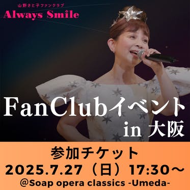 山野さと子 FanClubイベント in 大阪に参加することができる【チケット】です。山野さと子ファンクラブ「AlwaysSmaile」会員の方のみ参加することができます。山野さと子 FanClubイベント in 大阪〈イベント詳細〉開催日:2025年 7月 27日(日)時間:開演 17:30...