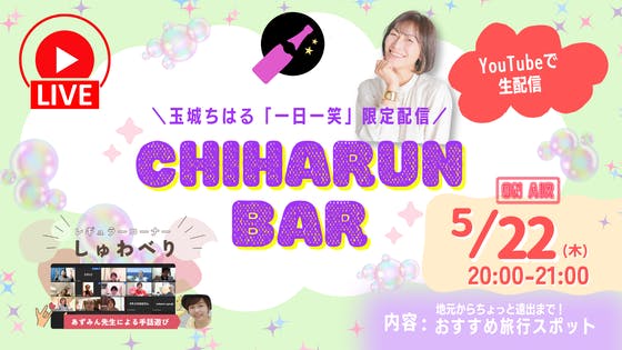 【5月『ちはるんばー』配信日決定】5/22(木)20:00~⳹ 内容:オススメの旅行スポットを教えて! ⳼地元の観光スポットからちょっと遠出してでも行きたい旅行先まで、メンバーがオススメしたい場所を紹介します!※YouTubeのみ配信です。チャットでぜひ参加してください!・しゅわべりコーナー・...