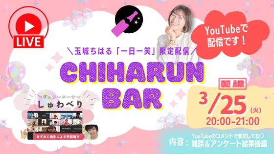 【3月『ちはるんばー』のお知らせ】下記の日程で決定いたしました3/25(火)20:00~⳹ 雑談配信&アンケート結果発表~後編 ⳼今回も雑談をしながら、アンケート結果を元に作戦会議をしていきます!YouTubeのみ配信です。コメントでぜひ参加してください!・しゅわべりコーナー・プレゼント企...