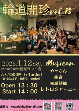 輪道開珍vol.13 開催!今回の輪道開珍vol.13も最高な出演者とともに、最高の音楽をお届けします! 出演者・絢音・レトロジャーニー・古瀬詩織・やッさん日時2025年4月12日(土)13:30 開場 / 14:00 開演 会場masa2sets 読売ランド店 チケット一般:1,500円高校...