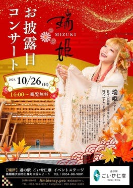 いつも瑞姫を応援いただきありがとうございます♪姫ノ宮スタッフです☆10月26日(日) 14:00~ 島根県大田市道の駅【ごいせ仁摩】観覧無料今までの衣装とは違った衣装での出演です❀.(*´▽`*)❀.お時間の合う方はぜひいらして下さいね^^神楽もされる大きなステージ