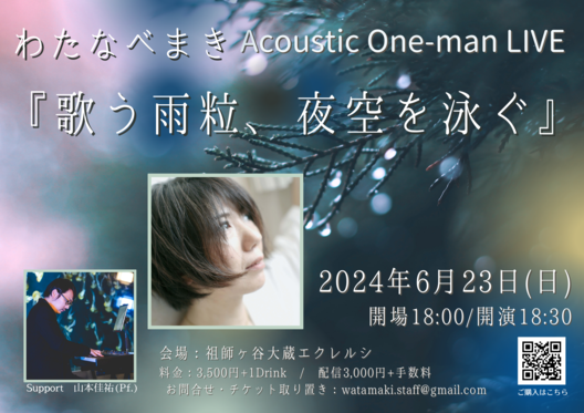 わたなべまきAcoustic One-man LIVE『歌う雨粒、夜空を泳ぐ』既にホームページ、SNS等で情報を解禁しておりますが、この度、約半年ぶりとなるわたなべまきのワンマンライブを開催します!日時は6月23日夜、場所は、東京都世田谷区にあるグランドピアノ常設のLIVEハウス、祖師ヶ谷大蔵...