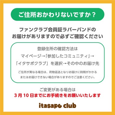 いつもイノイタルを応援いただき、ありがとうございます。応援してくれる皆様のおかげで、もう少しでイタサポクラブ5年目に突入します!今月中に「会員証ラバーバンド(2024版)」をお届けいたします★その際には「ご登録いただいているご住所」にお届けとなりますので、住所のご確認をお願い致します。変更があ...