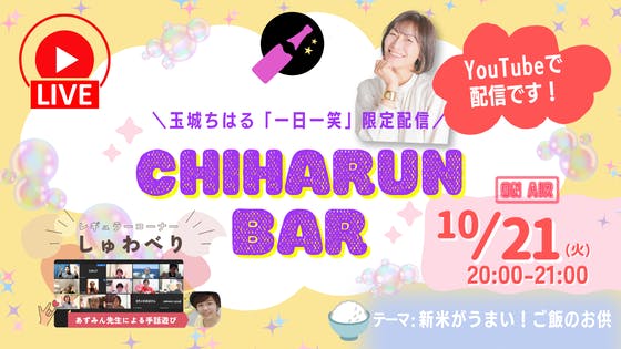 【10月『ちはるんばー』配信日決定】10/21(火)20:00~⳹ テーマ:飯テロ回新米がうまい!ご飯のお供⳼食欲の秋!新米の季節ですね!ご飯がバクバクすすむ、オススメのご飯のお供を教えて下さい!玉城が実食をしながらお送りします。飯テロ回ですご注意ください月当番(ZOOM参加者)を募集していま...