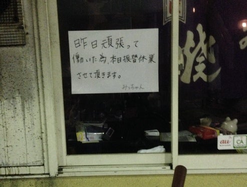 定期的に写真の整理をするのですがこんなのが出てきました。「昨日頑張って働いた為、本日振替休業させて頂きます。」堂々としててかっこいいよなぁたしか神戸にいた時代(10年前とか)にホッコリして思わず撮った写真。頑張り過ぎた後には休んでもいいよな◎今日は身体を休める大事な日でした。明日からまた励むっ...