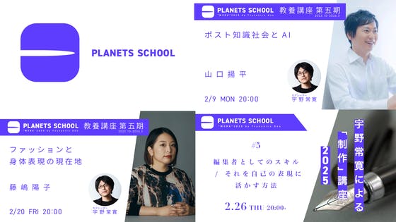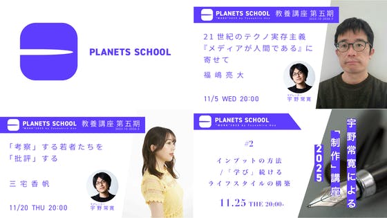 宇野常寛の〈技術〉をまるごと伝授する「制作講座」が新たにスタート!PLANETS SCHOOL秋学期開講中!PLANETS SCHOOLは「遅いインターネット」や「モノノメ」を手掛ける評論家・宇野常寛が主宰するオンラインの私塾です。2025年秋学期からは、宇野常寛のファシリテーションのもとで多...