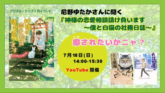 デジタル・ケイブの7月イベントは、作家・尼野ゆたかさんが登場!7/15発売の最新刊『神様の恋愛相談請け負います』を中心に、癒しの作品群についてお話をうかがいます。「戦国昼寝姫、いざ参らぬ」「大江いずこは何処へ旅に」「お直し処猫庵」シリーズなど、ほのぼのとしたキャラクター、人生のつらさをふんわり...