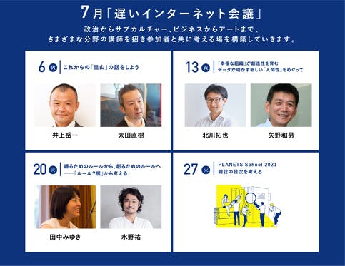 PLANETS CLUBでは毎月、政治からサブカルチャー、ビジネスからアートまで、さまざまなジャンルのオリジナル記事と動画をお届けしています。7月も毎週開催している対談イベント「遅いインターネット会議」をはじめ、宇野常寛の「書く」「編集する」「発信する」技術を学ぶ「PLANETS School...