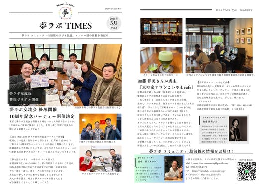 【夢ラボ コミュニティのニュースレター最新刊を発行しました!】2026年3月号 最新ニュースレターを公開します。夢ラボ コミュニティのイベントやラジオ放送、メンバー様のご活躍などを掲載いたしました。~今号のポイント~◇渋谷区笹塚で開催した夢ラボ交流会◇夢ラボ10周年記念パーティーにつきまして◇...