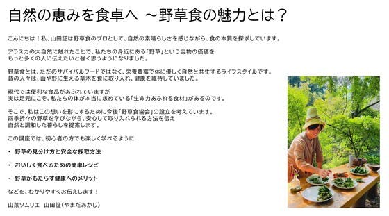 【初めての方には、基礎講座の動画をプレゼントします】基礎講座は、野草を見分ける上で基本となる専門用語や、植物を見分けるポイント、野草を食べる意味などを、動画にしたものです。お申し込みいただいた初めての方にはこの動画をプレゼントしていますので、講座前にぜひご視聴を済ませて、講座にご参加ください。...