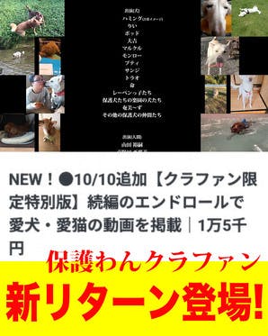 保護わんファンクラブのメンバーの皆さんへこんにちは!この度、急きょクラファンに新リターンを作りました。前作のエンドクレジットと同じような形で、続編映画のエンドクレジットに皆さまのご家族の愛犬猫の動画(スマホなどで撮影したもの)を掲載するリターンをご用意いたしました。*すでに他のリターンでご支援...