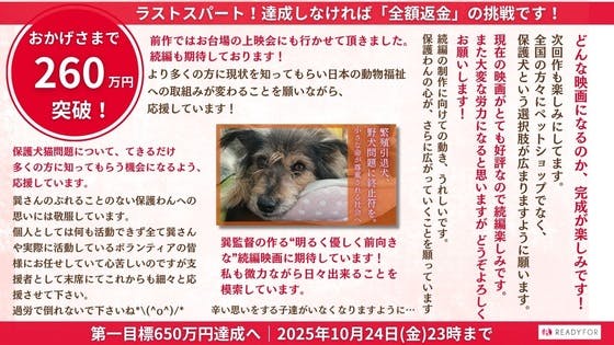 こんばんは!保護わん代表の巽です。クラファン企画として、映画上映記録の動画(DVD特別映像の短縮版)を上げました。編集していても、色々と思い出してあの熱い時間には泣けます(いや、まだ映画『吾輩は保護犬である』の上映は続くわけですが)さて、連日の様にお伝えしてしておりますクラファンの方ですが、ど...